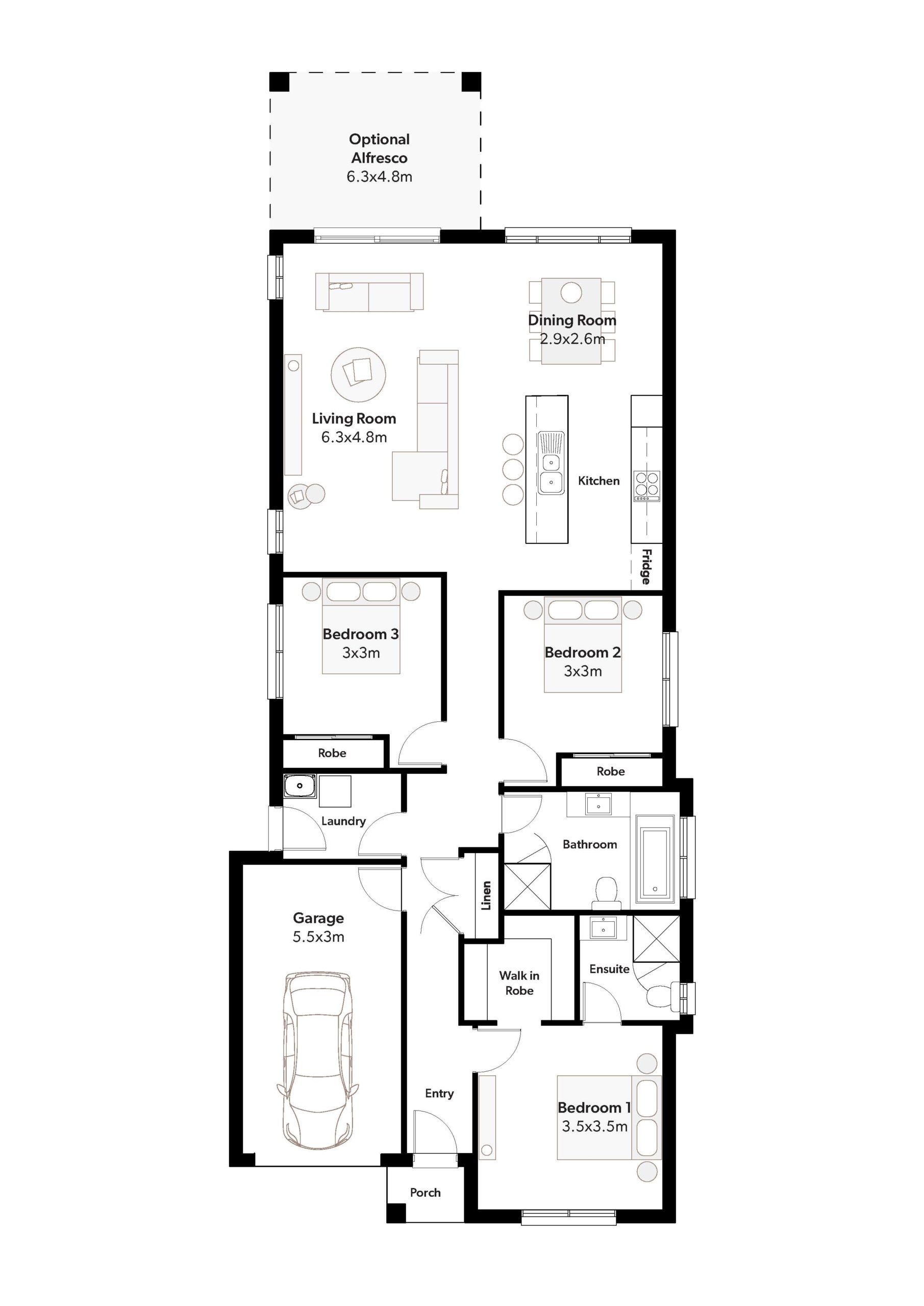 Three generous bedrooms, master with walk-in-robe and ensuite, open plan living, galley kitchen with island bench… A compact and affordable house ready for you to make it a home. Designed specifically for narrow lots with as little as 10 metre frontage.